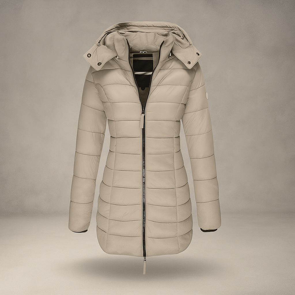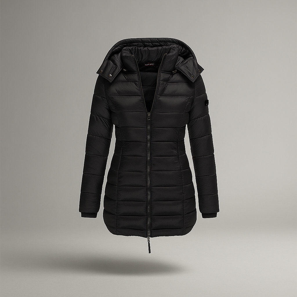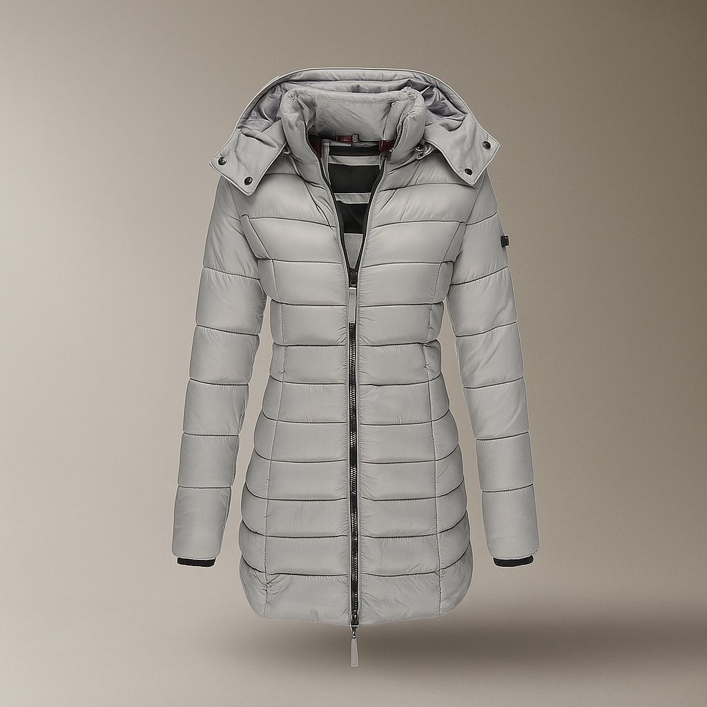 Este abrigo acolchado largo con capucha combina diseño moderno y protección contra el frío. Su silueta ajustada estiliza la figura, mientras que el acolchado ligero y térmico mantiene una temperatura confortable incluso en los días más fríos.