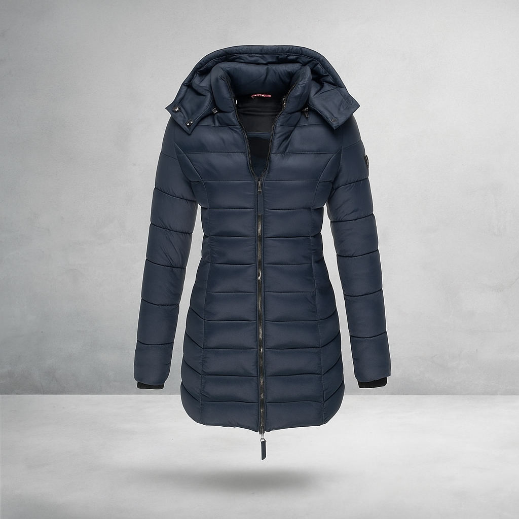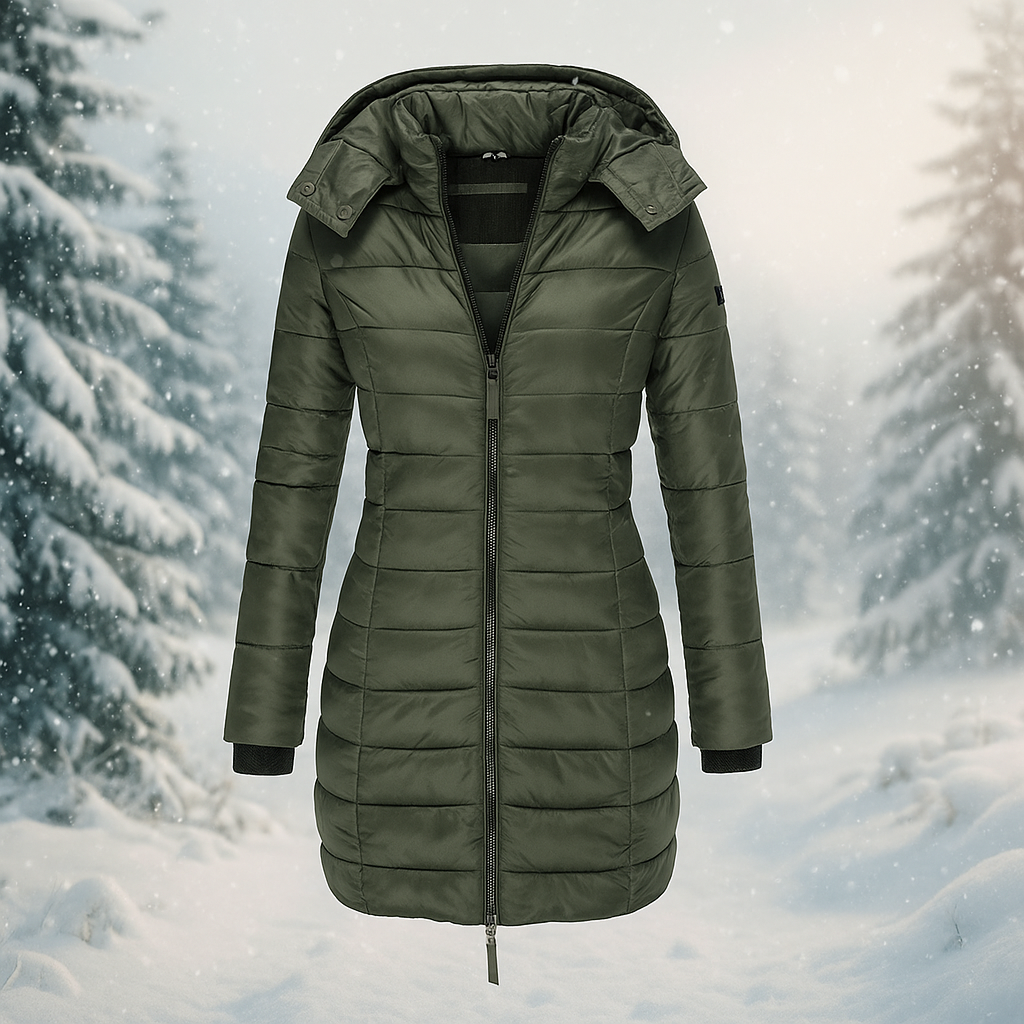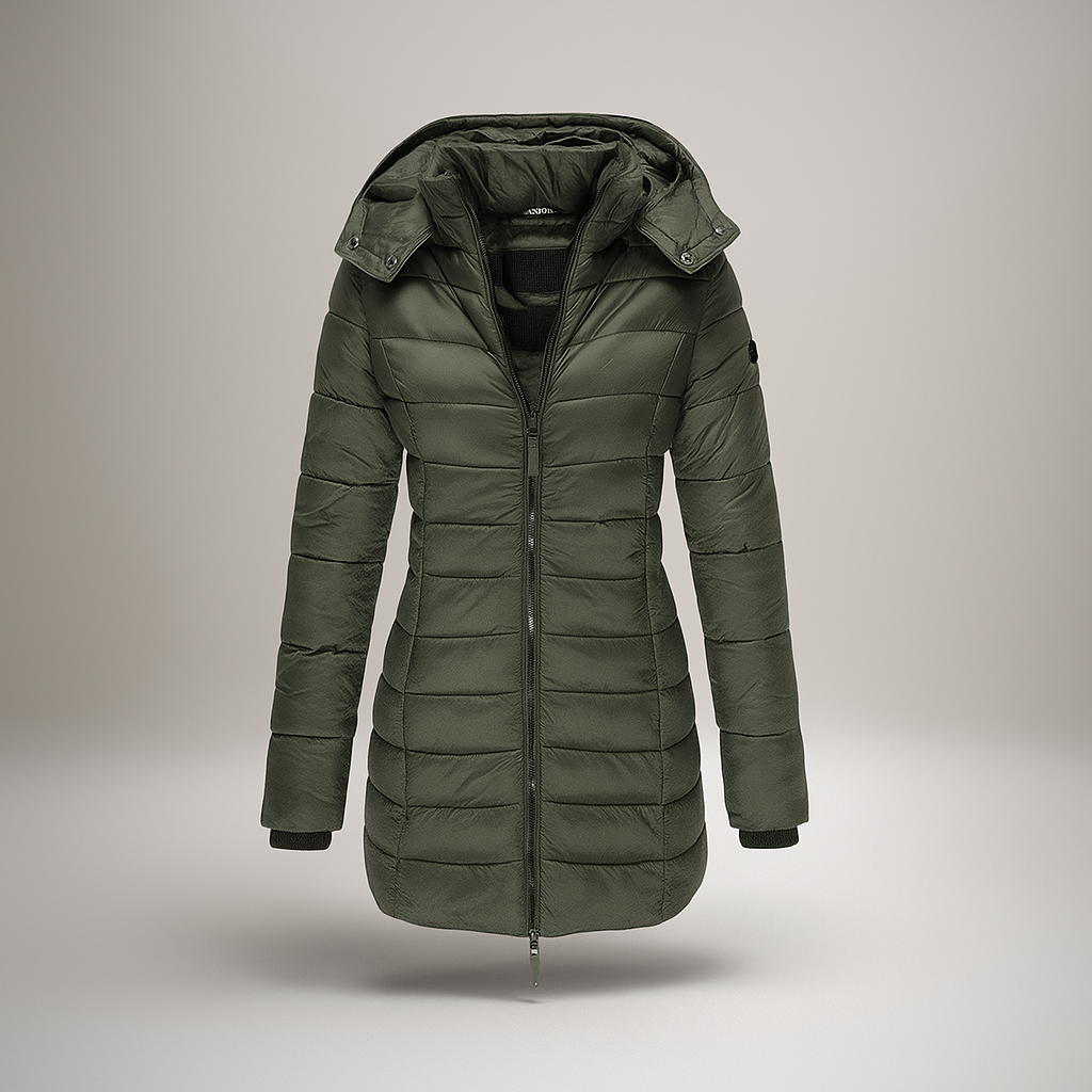 Este abrigo acolchado largo con capucha combina diseño moderno y protección contra el frío. Su silueta ajustada estiliza la figura, mientras que el acolchado ligero y térmico mantiene una temperatura confortable incluso en los días más fríos.