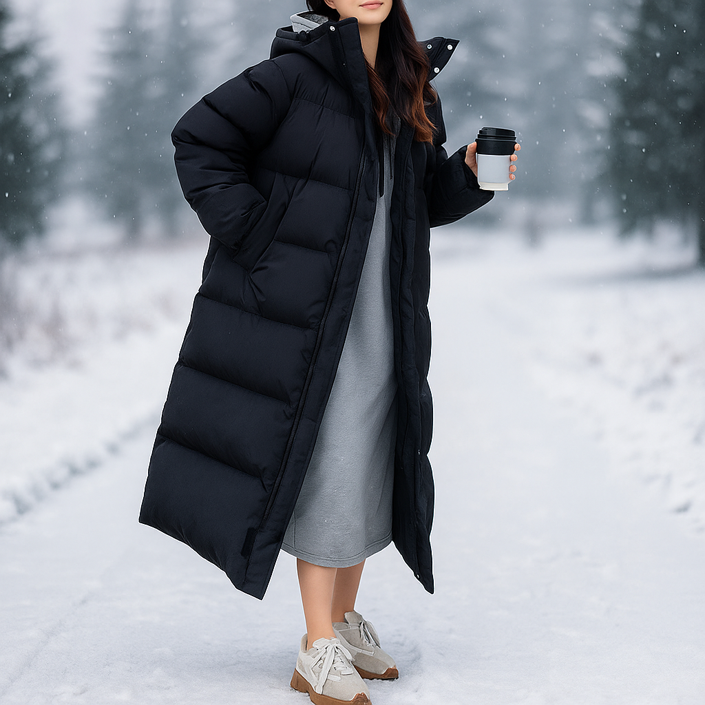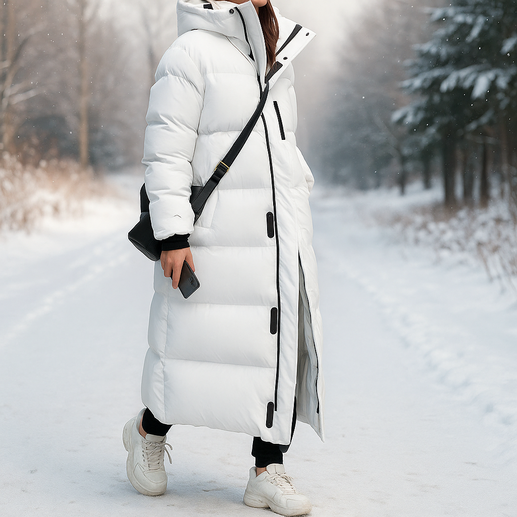 Este abrigo acolchado largo ofrece una protección total contra el frío más intenso, combinando diseño moderno con funcionalidad. Su silueta alargada crea una barrera eficaz contra el viento y la nieve, mientras que el blanco invernal transmite pureza y sofisticación en cada detalle.