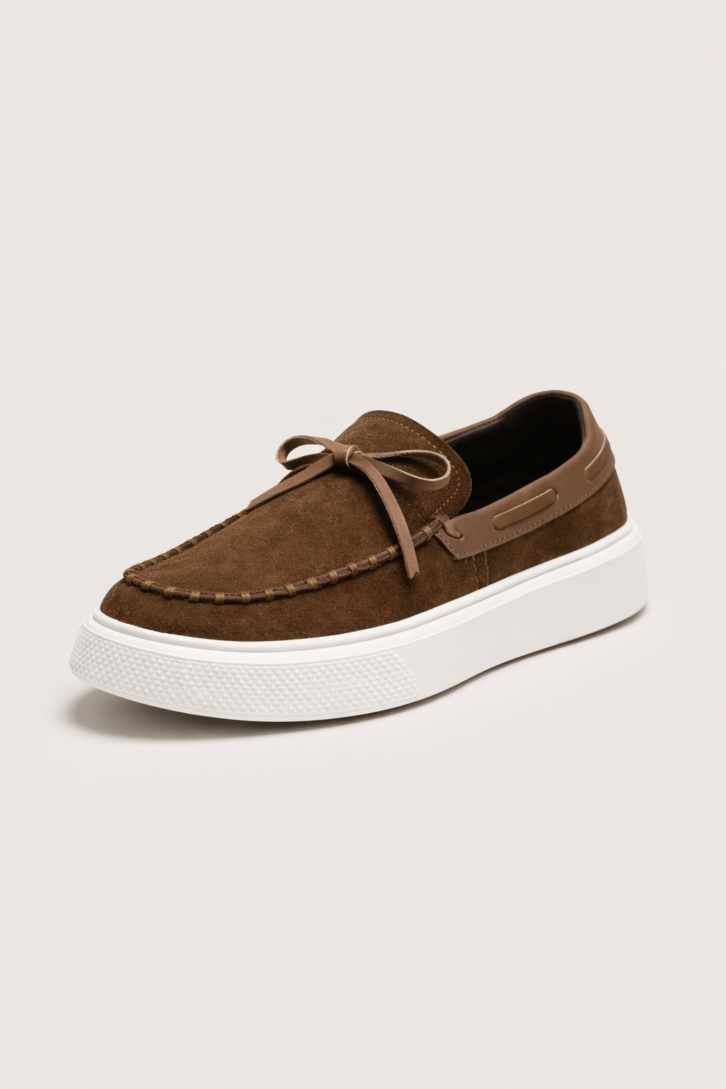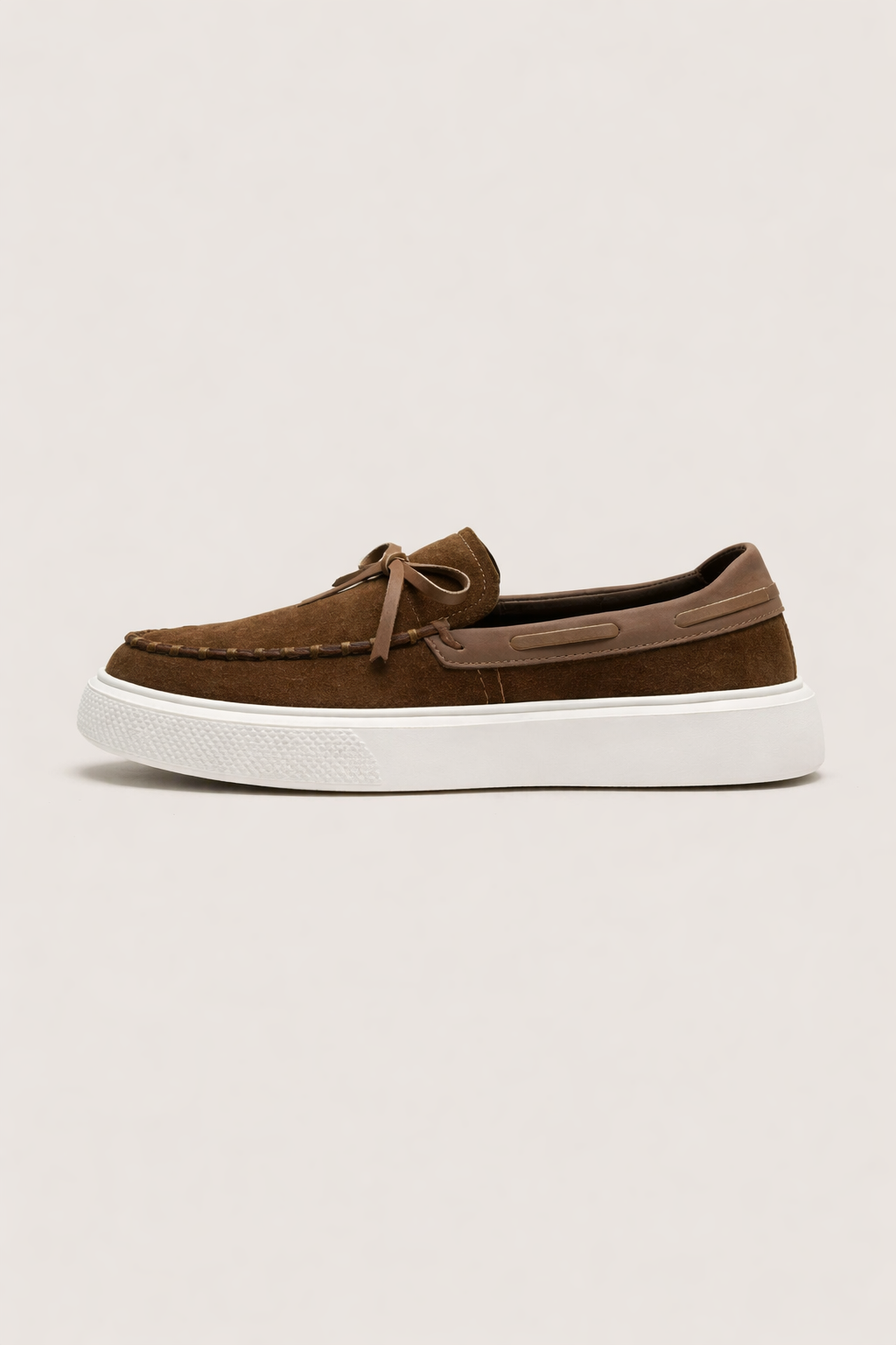 La gamuza en tono café le da un acabado más cálido y agradable, mientras la suela blanca gruesa crea un contraste moderno que lo hace actual. El lazo frontal suma un detalle clásico que aporta carácter sin exagerar. Es un modelo versátil que combina fácil con jeans, pantalón chino o incluso con un conjunto.