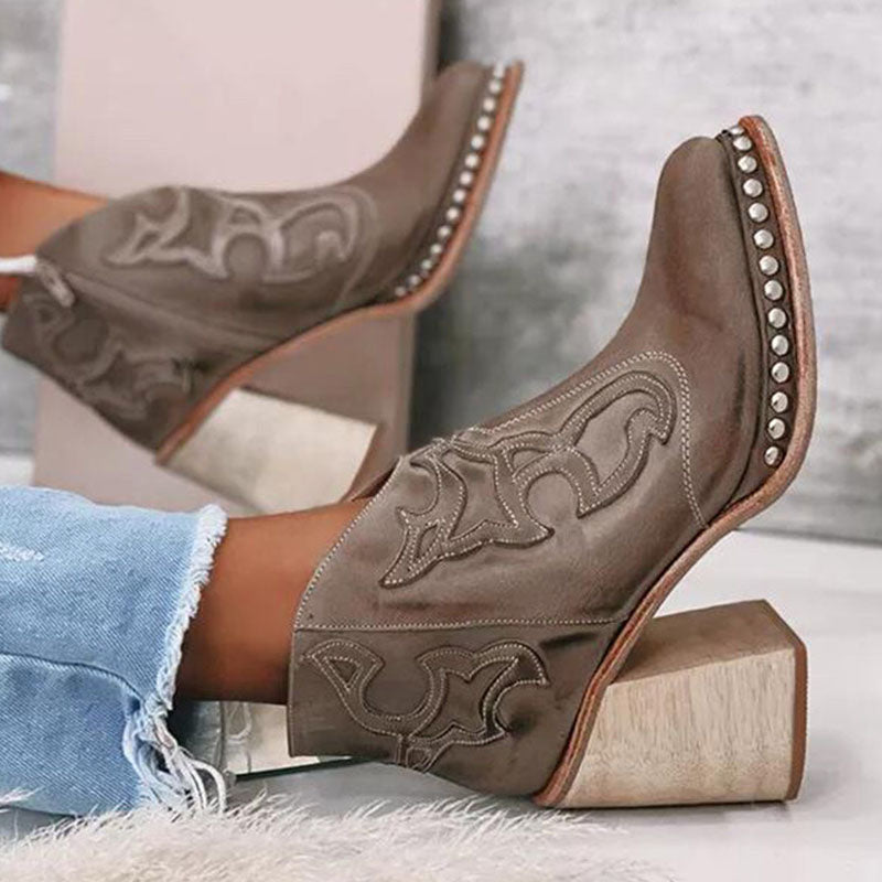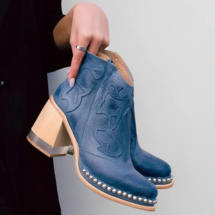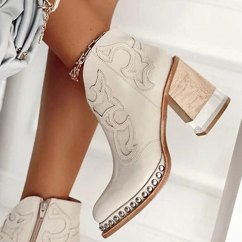 Sumérgete en la elegancia y comodidad sin igual con las exquisitas botas Paulette de piel bordada.