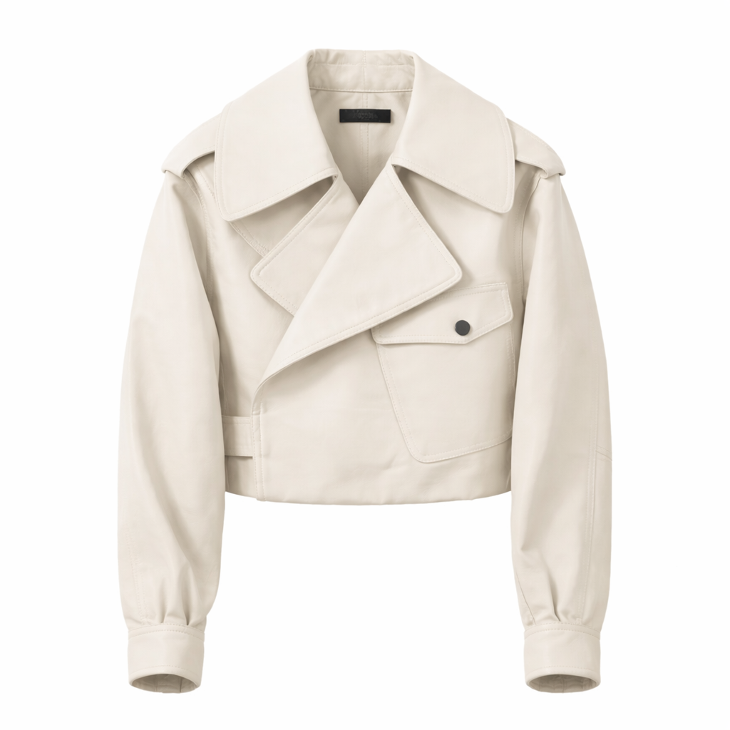 Se usa como chaqueta corta para entretiempo y frío moderado. Al llevarla abierta, el cuello se abre hacia los lados y deja ver el interior del delantero. Al cerrarla, el frente queda solapado y mantiene el interior oculto. El borde inferior termina recto y marca con claridad el final del largo.