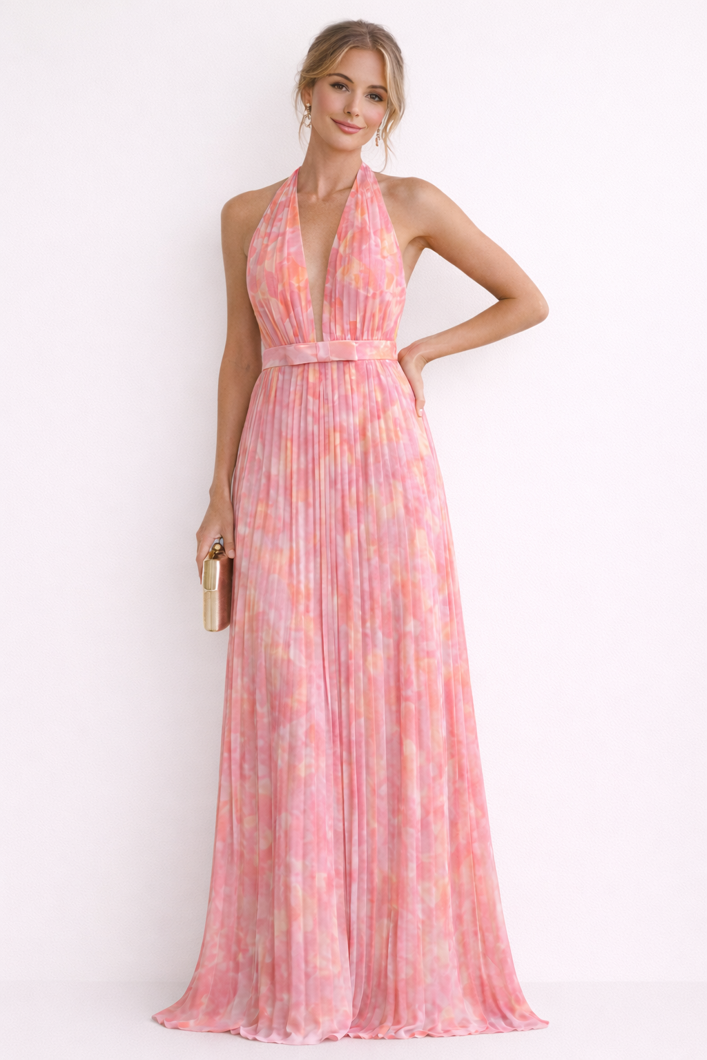 - Corte: Maxi con cintura definida y halter estructurado