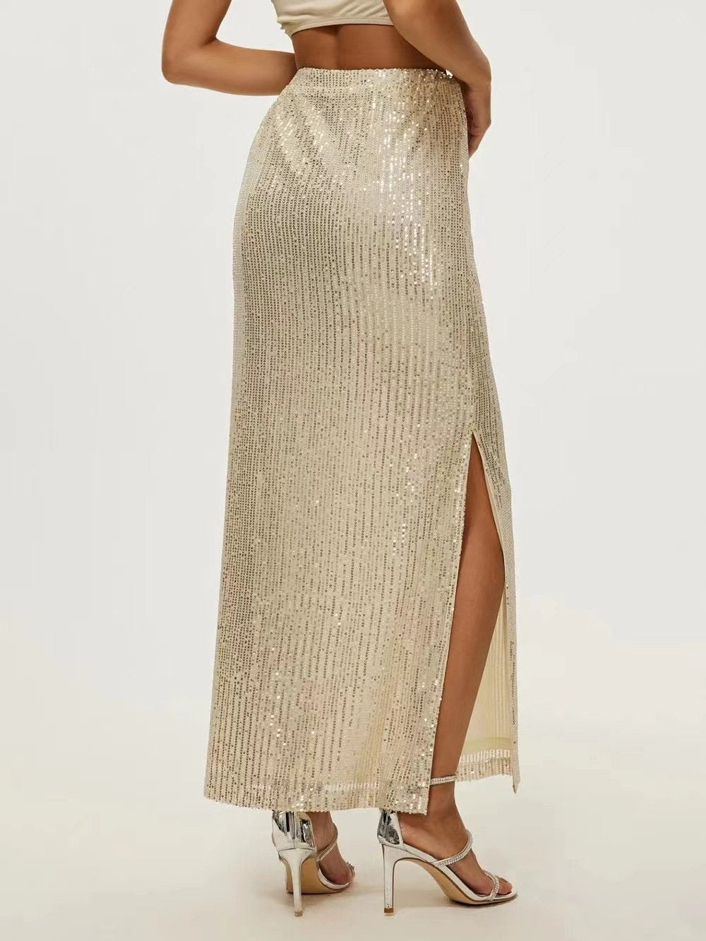 La falda transmite una presencia clara desde el primer vistazo. Las lentejuelas reaccionan a la luz de forma gradual, generando destellos que acompañan el movimiento con discreción. El corte alargado aporta continuidad visual y la abertura lateral introduce un gesto natural que favorece la agilidad al caminar.