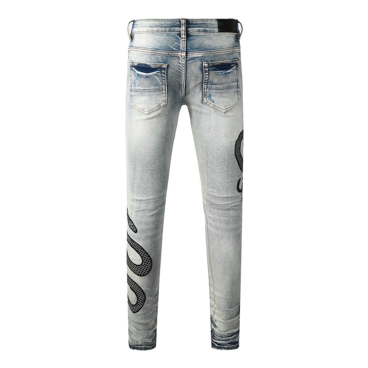 Estos pantalones están pensados para destacar desde el primer vistazo. El corte slim se ajusta a la pierna creando una silueta estilizada y actual, mientras que el diseño rompe con lo convencional gracias al estampado de serpiente y los detalles desgastados estratégicos. Es un vaquero con personalidad clara, pensado para looks con actitud.