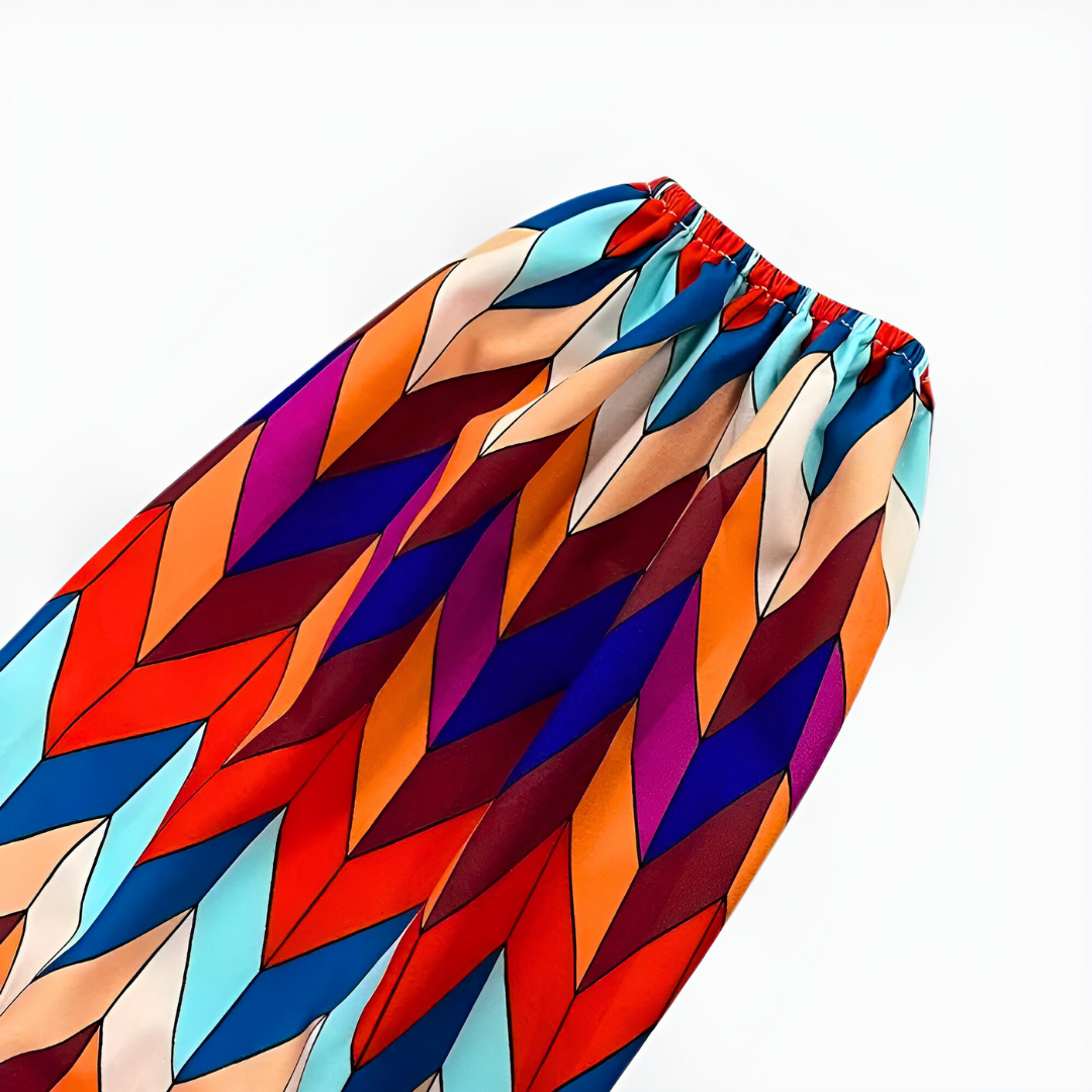 Este vestido despliega un vibrante encanto con sus atrevidos motivos geométricos. Confeccionado en un lujoso tejido, este vestido tiene mangas abullonadas y cintura entallada, creando una pieza de moda perfecta para todas las ocasiones.