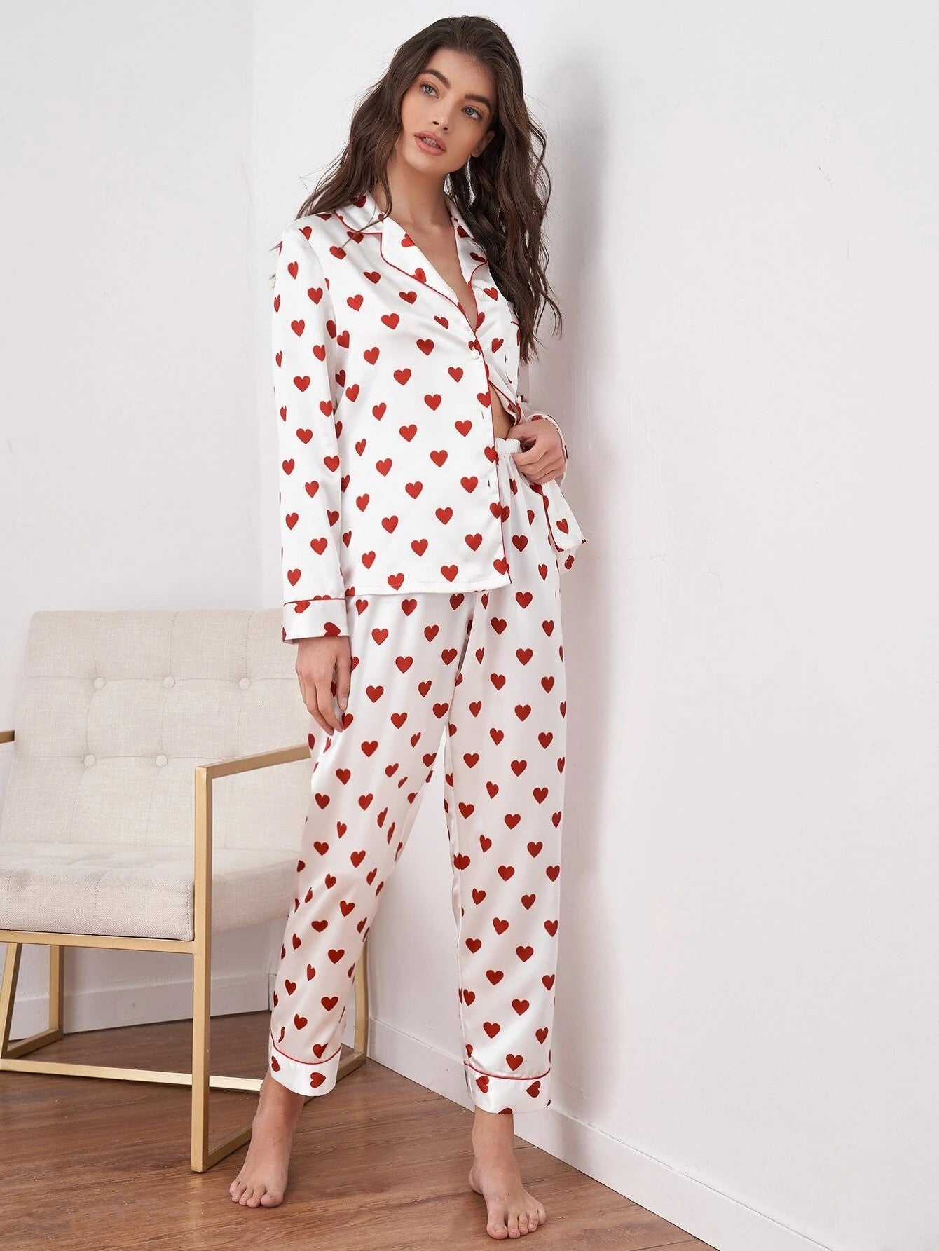Este conjunto de pijama se presenta como una prenda de dos piezas, compuesto por camisa de manga larga y pantalón recto. La camisa define un cuello abierto con solapas suaves, botonadura frontal continua y un bolsillo integrado. El estampado corazón se distribuye de forma regular en ambas piezas, manteniendo una lectura visual uniforme y ordenada.