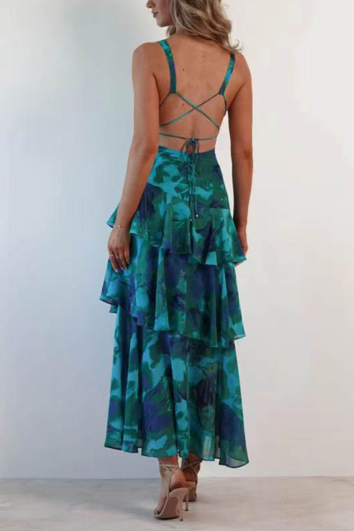 Este vestido largo con estampado floral tiene un movimiento ligero que acompaña cada paso. El escote profundo en V estiliza la parte superior, mientras que la falda en capas crea una silueta fluida y femenina. La caída del tejido aporta un efecto suave que realza el diseño.
