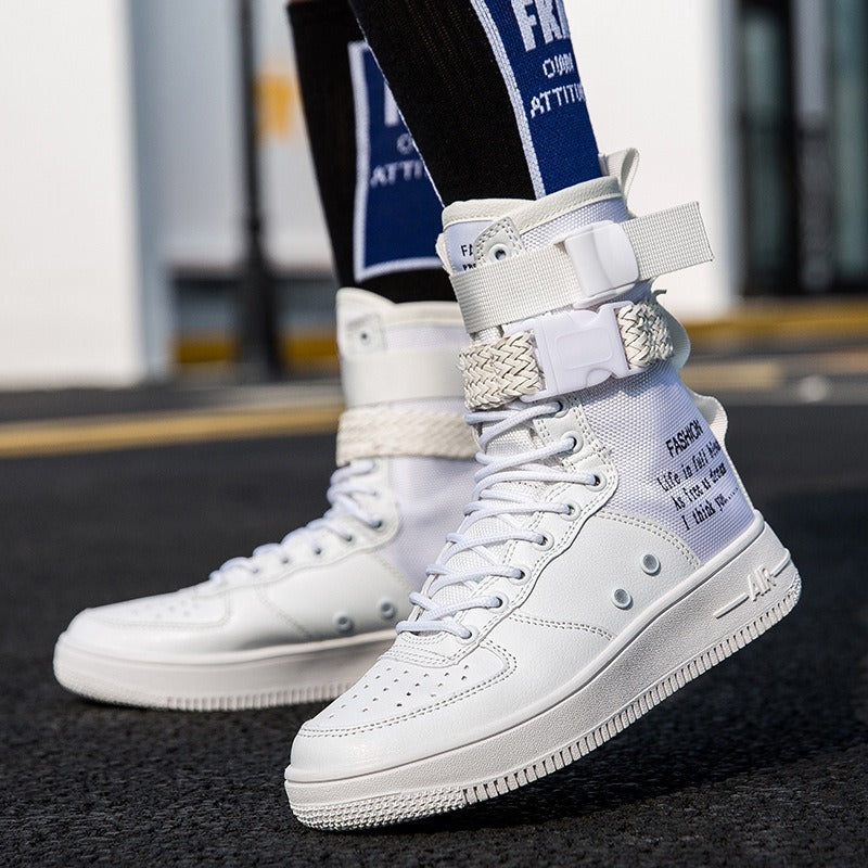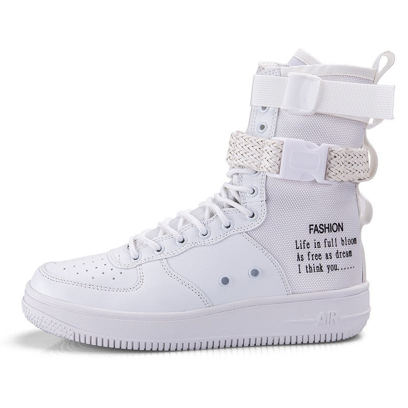 El exterior combina lona reforzada con paneles sintéticos y detalles técnicos como correas ajustables, ojales metálicos y hebillas decorativas. La caña alta ofrece soporte y un ajuste cómodo, mientras que el diseño gráfico aporta un toque contemporáneo que no pasa desapercibido.