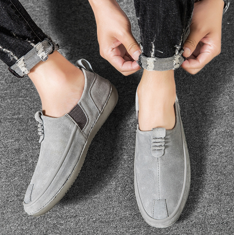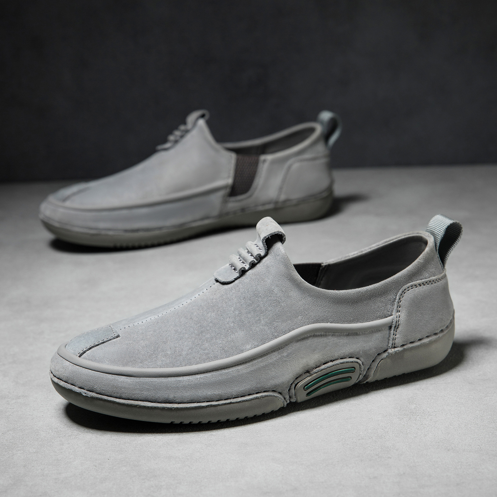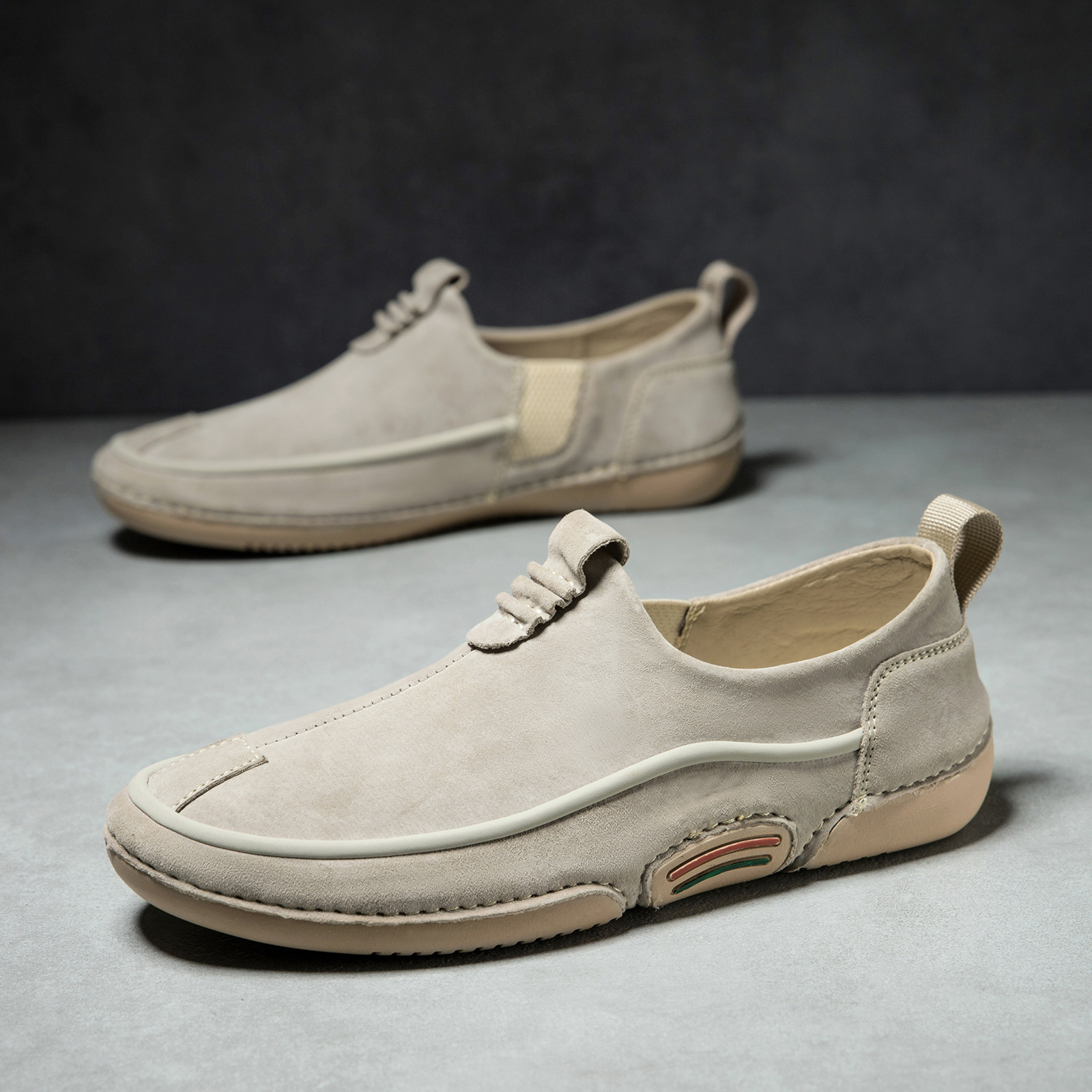 Zapatillas tipo slip on de ante para hombre con suela ligera presenta corte bajo y diseño cerrado sin cordones. El exterior suave incluye costura visible alrededor de la punta y acabado uniforme en el empeine. Es fácil de poner para salir, caminar trayectos cortos o asistir a una reunión informal. Su diseño ligero permite uso diario.