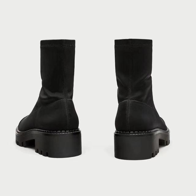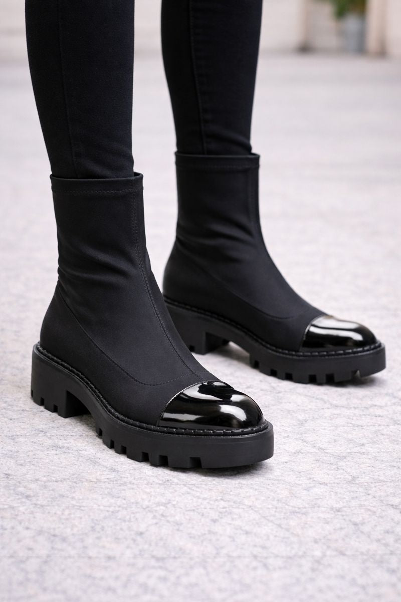 El diseño combina una caña elástica ajustada al tobillo con una base sólida de plataforma. La estructura envuelve el pie con líneas limpias y refuerzos discretos, manteniendo estabilidad y soporte durante el uso continuo. La suela elevada presenta tracción marcada y un perfil funcional pensado para recorridos urbanos.