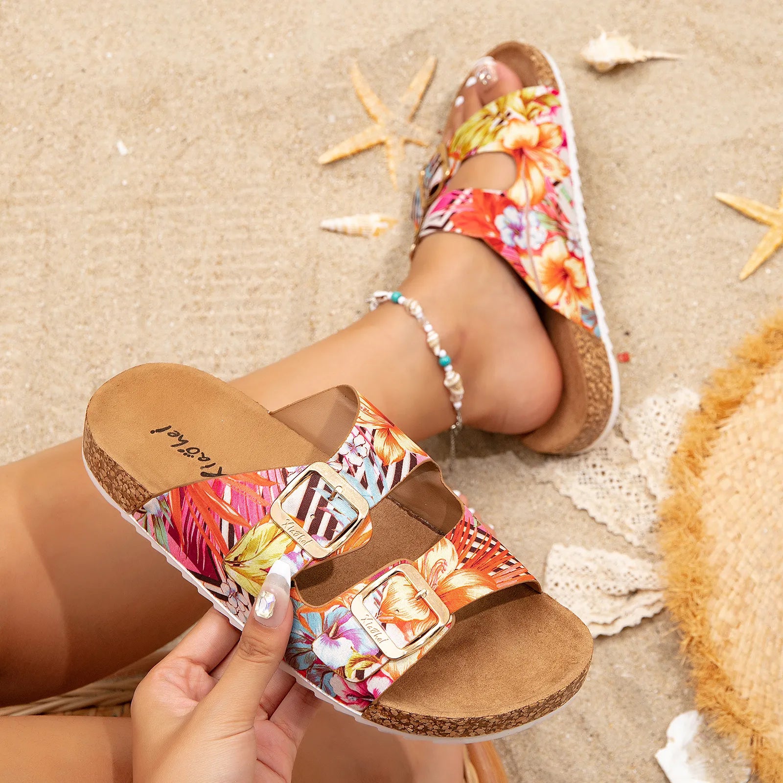 Sumérgete en el encanto de nuestra exclusiva colección de Sandalias Planas Casuales, diseñadas para marcar tendencia con sus estampados asombrosos. Cada par te llevará a un viaje visual de colores y patrones cautivadores que te envolverán en un aire de frescura y estilo.