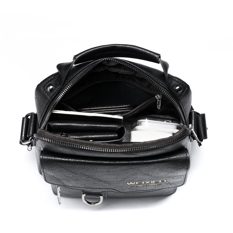 El acabado texturizado de la piel sintética aporta un toque sofisticado, mientras que los múltiples bolsillos frontales y cremalleras metálicas refuerzan su carácter práctico. El asa superior acolchada y la correa ajustable permiten un transporte cómodo y versátil, adaptándose a distintas situaciones del día.