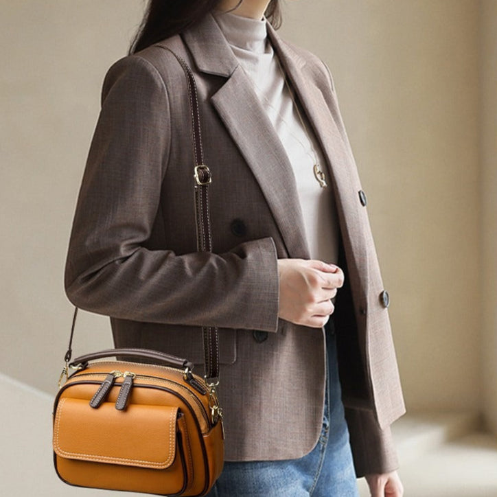 La silueta compacta incluye múltiples compartimentos con cremallera y un bolsillo frontal con solapa, ideal para mantener todo en orden.
