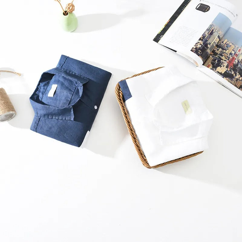 Esta camisa de lino para hombre ofrece un diseño minimalista con un estampado abstracto de inspiración moderna. El contraste geométrico en tonos neutros y azul profundo sobre el fondo blanco añade un toque artístico y contemporáneo sin caer en lo excesivo.