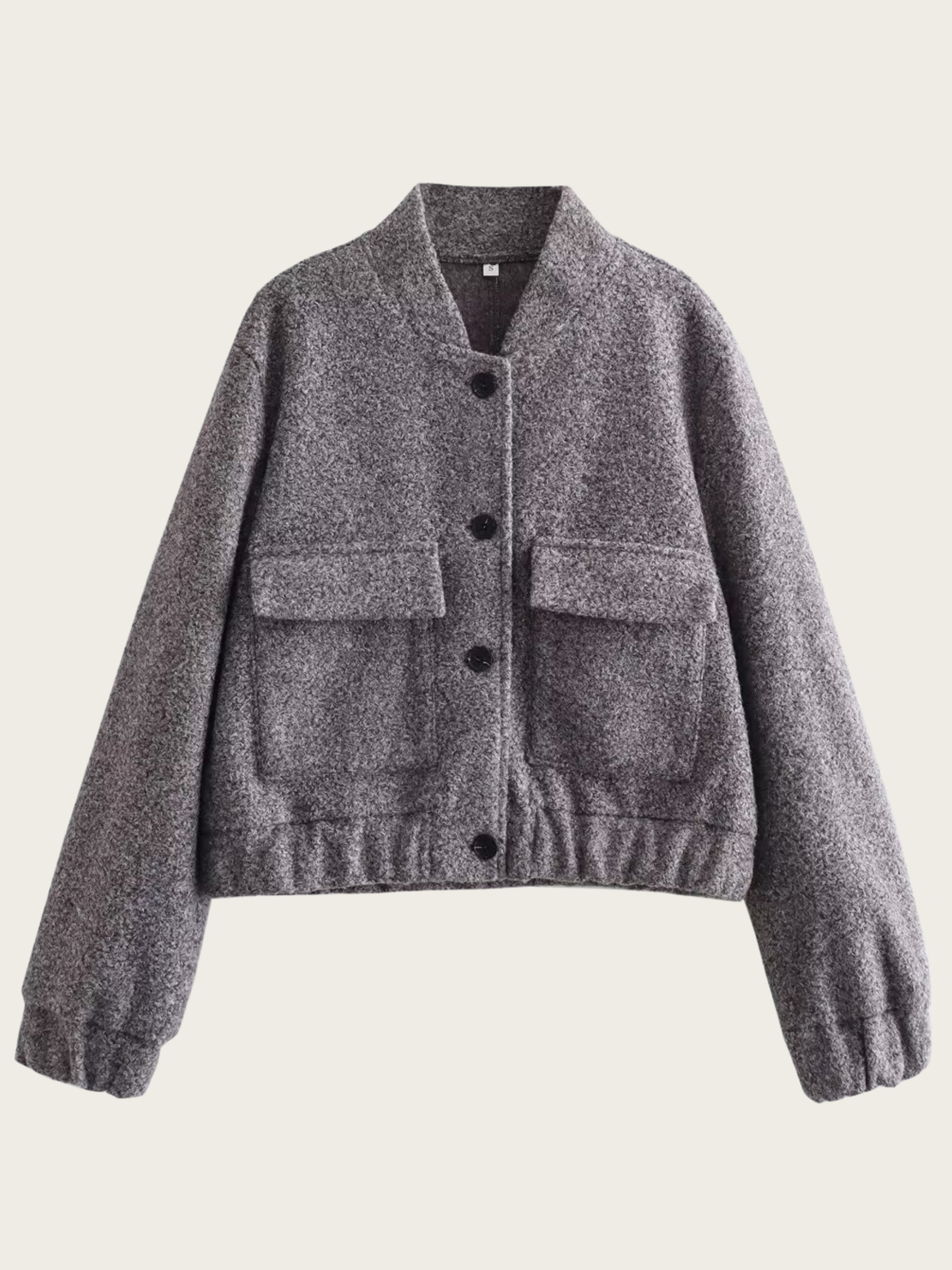 Esta chaqueta corta de lana gris está pensada para mujeres que buscan un equilibrio entre sofisticación y estilo urbano. Su diseño minimalista, con botones frontales y bolsillos funcionales, aporta un aire moderno sin perder elegancia.