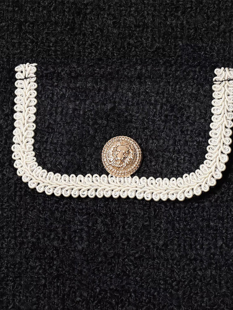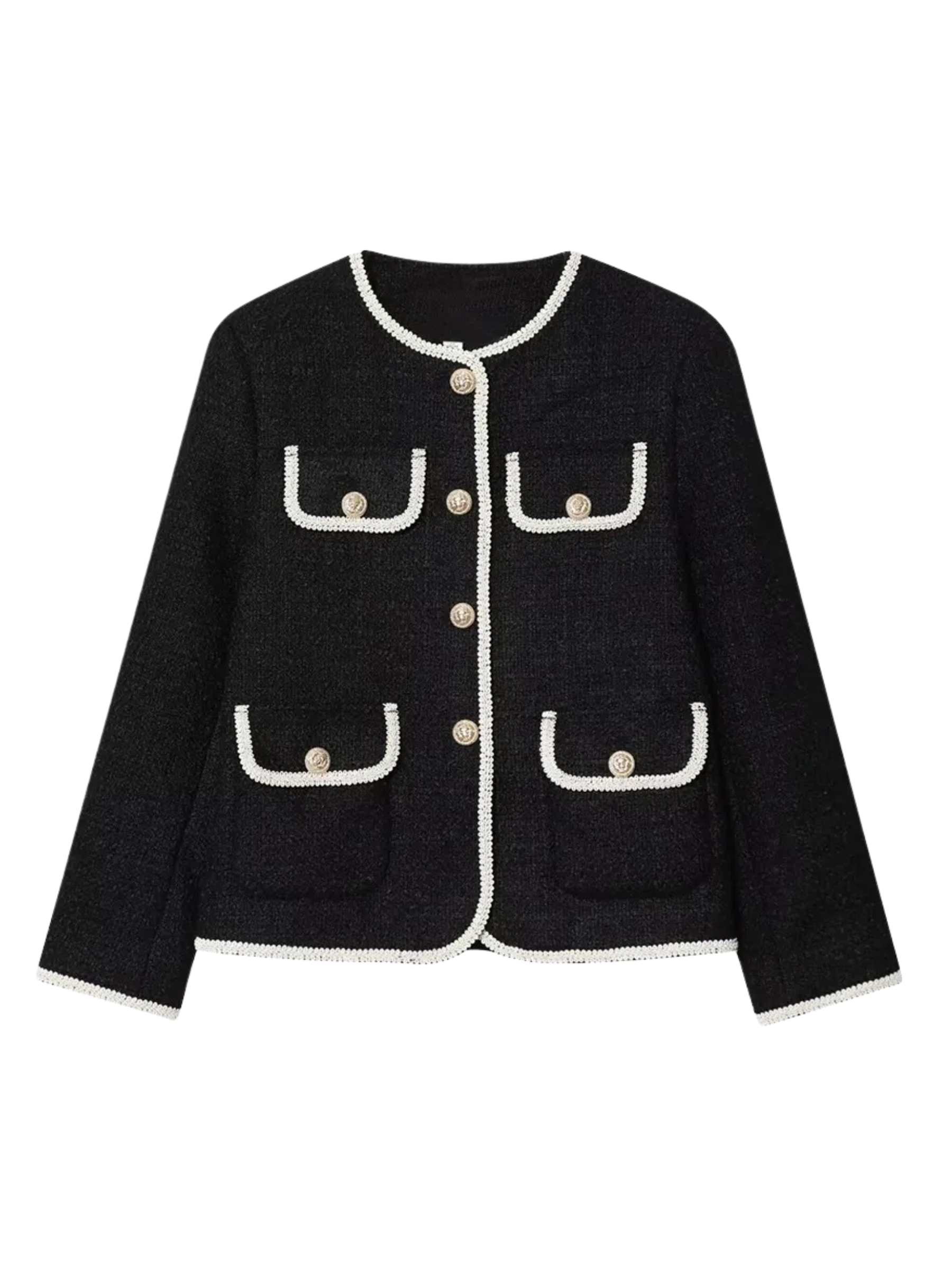 Los bolsillos frontales con solapa y los botones decorativos aportan un detalle refinado, mientras que los ribetes contrastantes destacan su estilo atemporal. El tejido estructurado mantiene la forma, garantizando una prenda versátil y duradera.