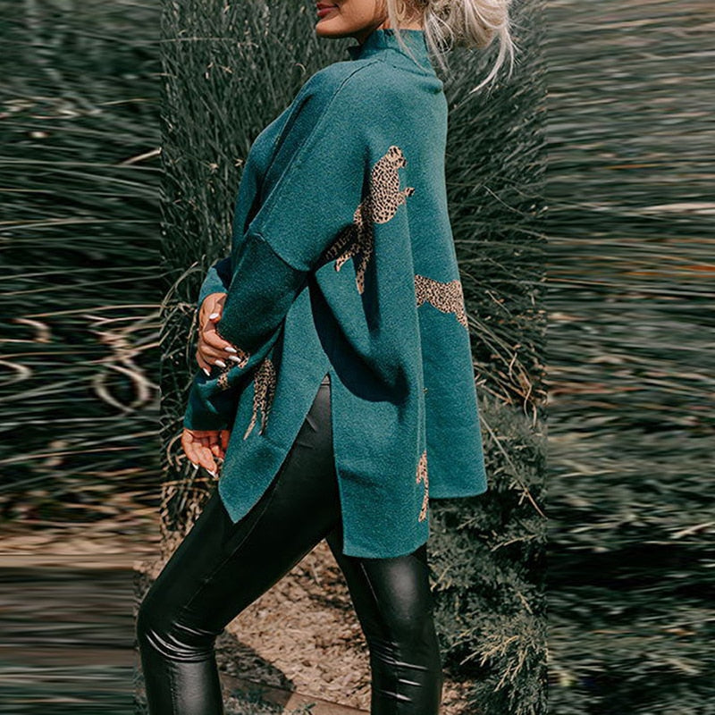 ¡Tu próxima obsesión ya está aquí! Jersey de punto ajustado sin forro con estampado de leopardo - cuello alto - mangas largas ajustadas - corte holgado que desemboca en un dobladillo recto con detalles laterales. ¡Ruge con estilo!