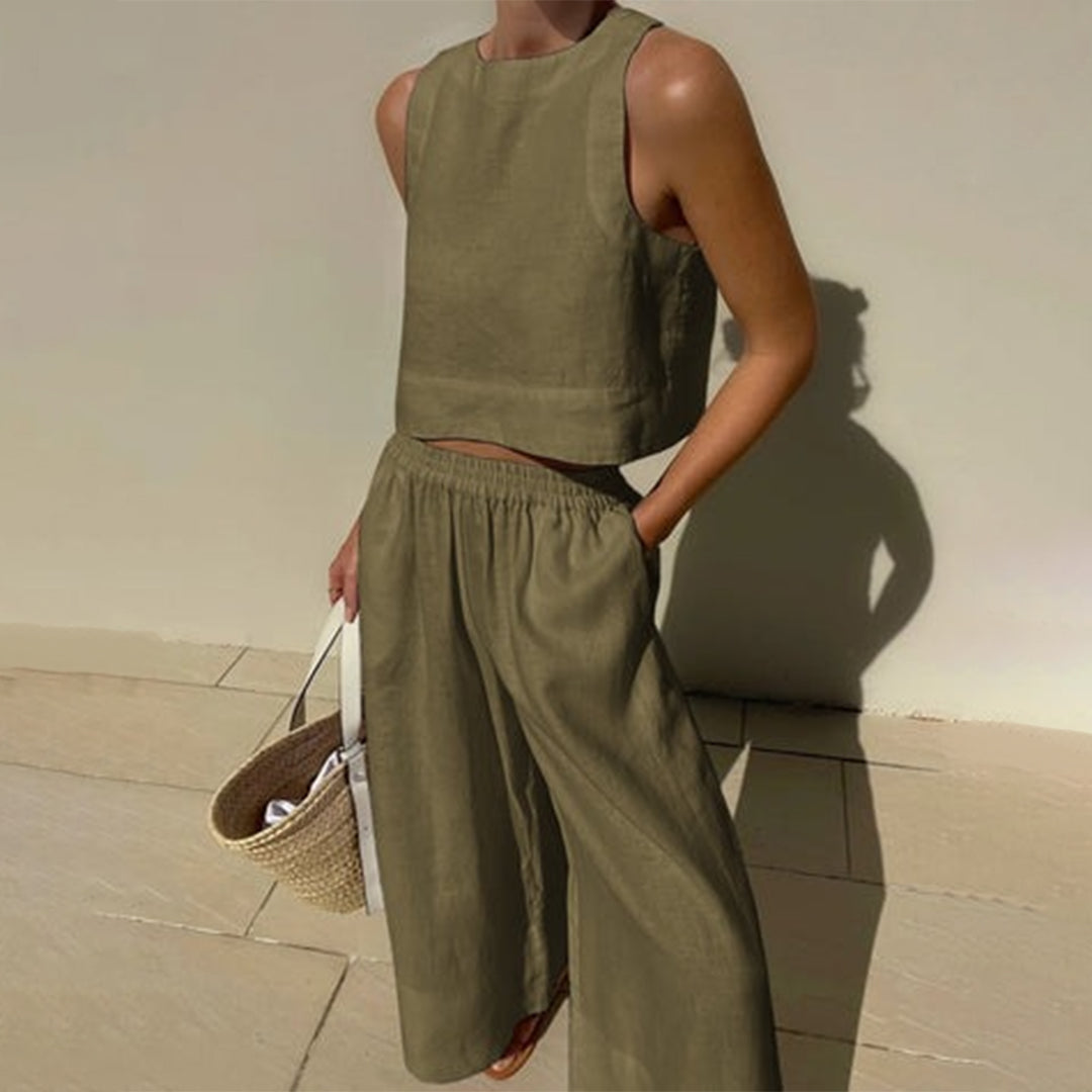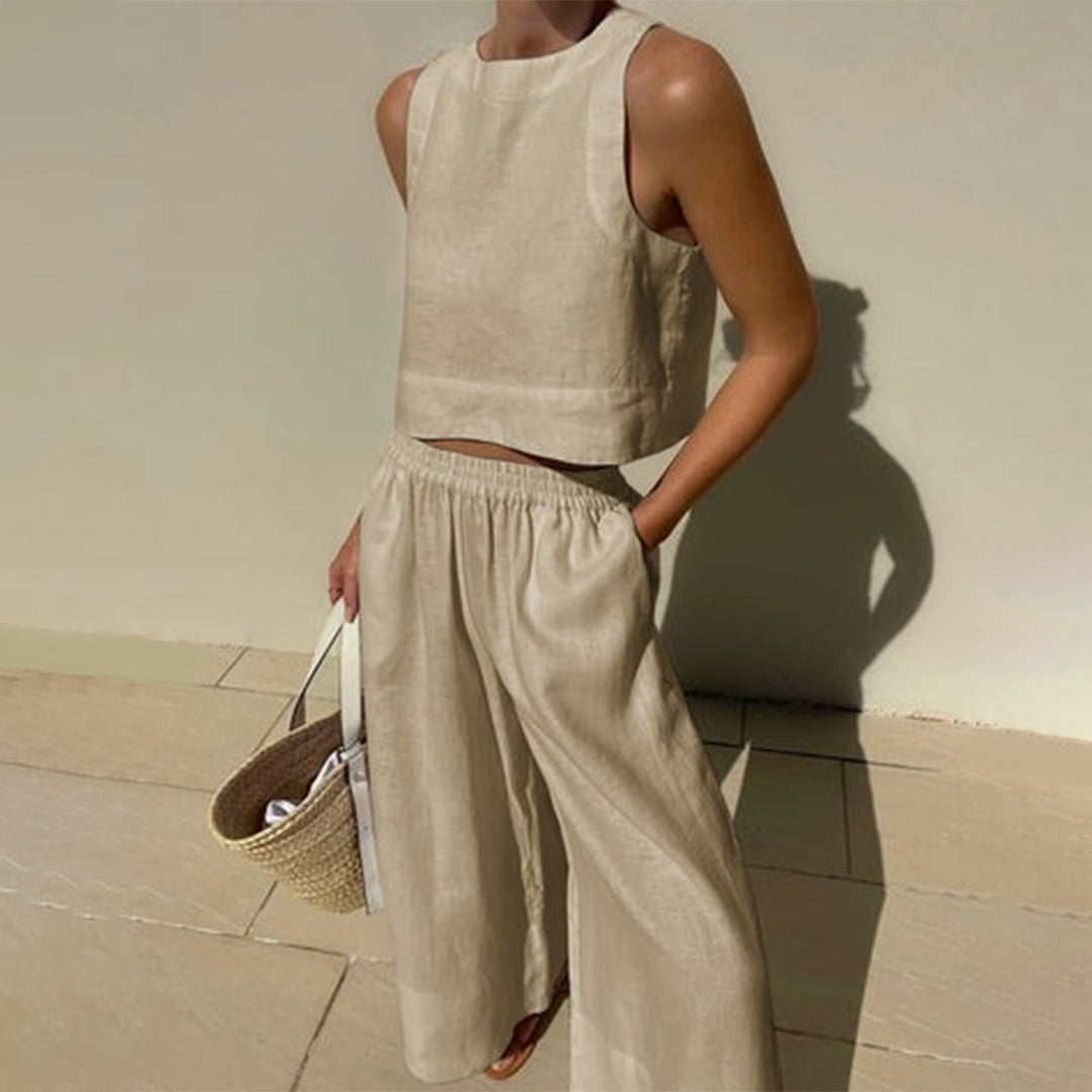 Descubra la magia del conjunto, un conjunto sofisticado que representa lo último en comodidad y estilo. Compuesto por un top sin mangas y un pantalón de pierna ancha, el conjunto es perfecto para todas las mujeres que buscan un look relajado y elegante.