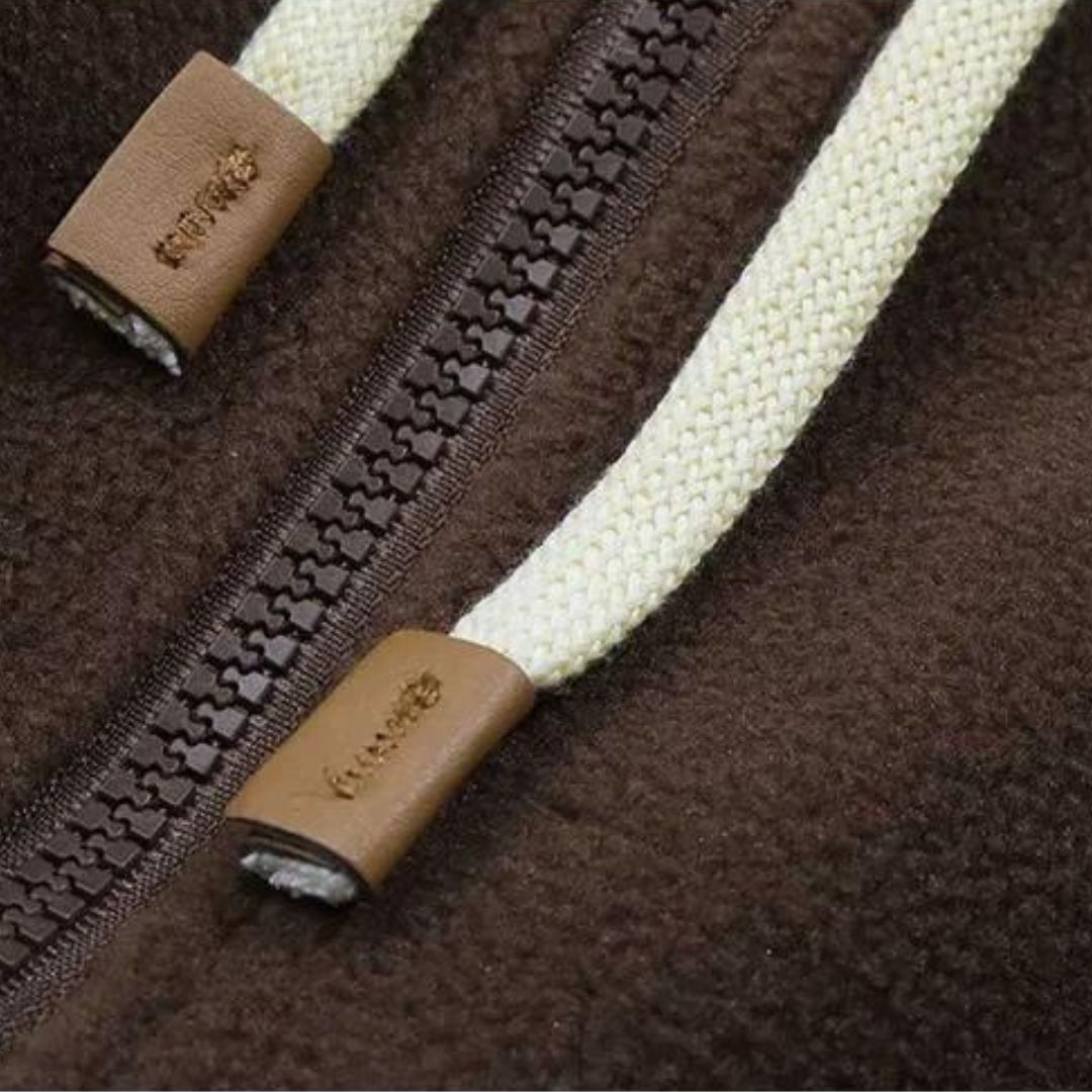 Mantente abrigado y con estilo con esta chaqueta polar con capucha y estampado patchwork Leah: una chaqueta polar con capucha y un elegante estampado patchwork. La combinación de tonos crema y marrón añade un toque de elegancia informal, mientras que el cierre de cremallera garantiza la practicidad para el uso diario.