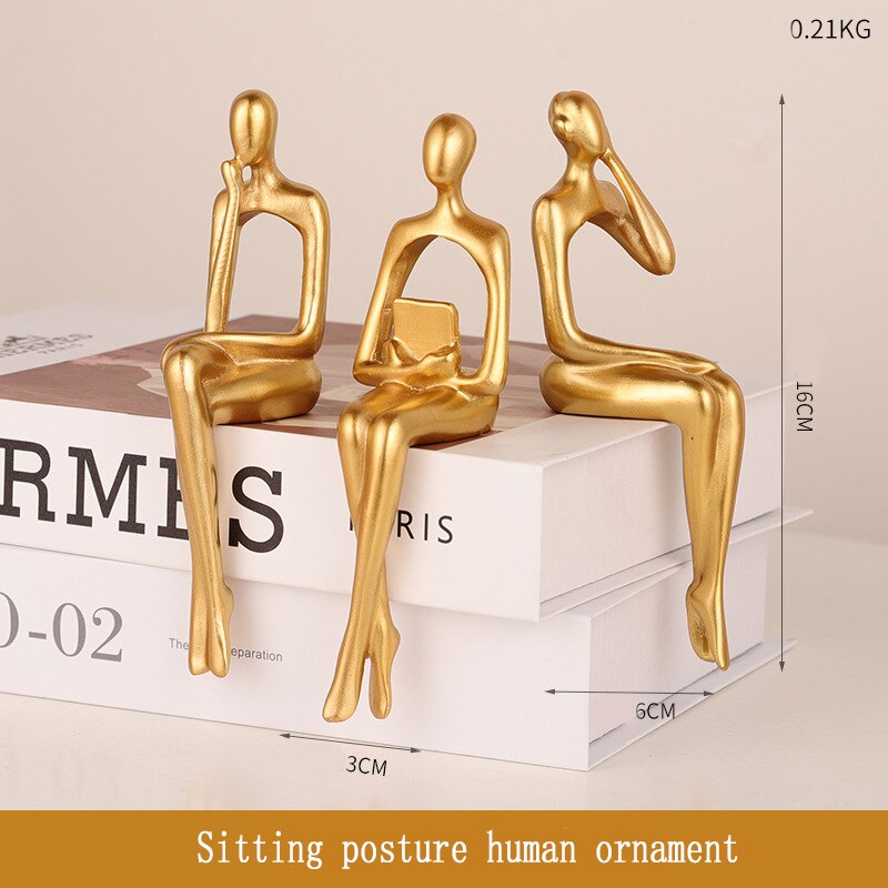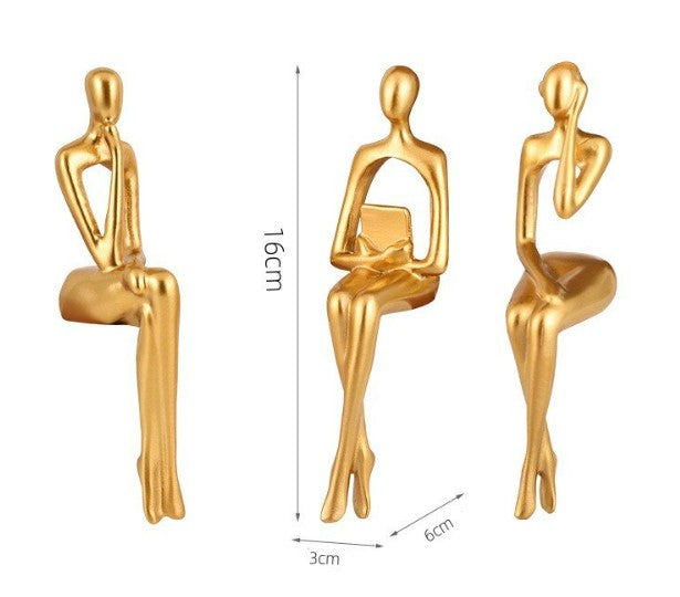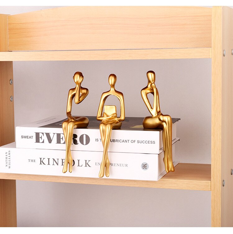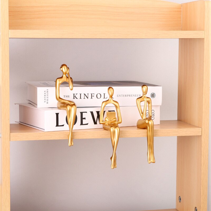 Descubre una colección de accesorios de decoración para estanterías en tu hogar. Destaca una estatua abstracta de resina y elegantes miniaturas modernas en tonos dorados.