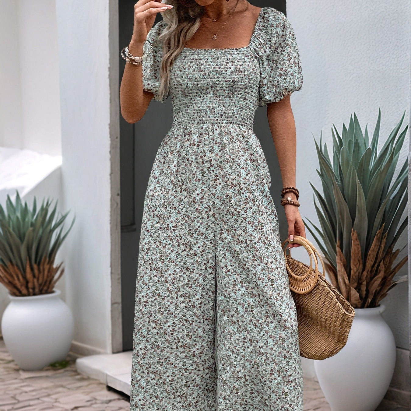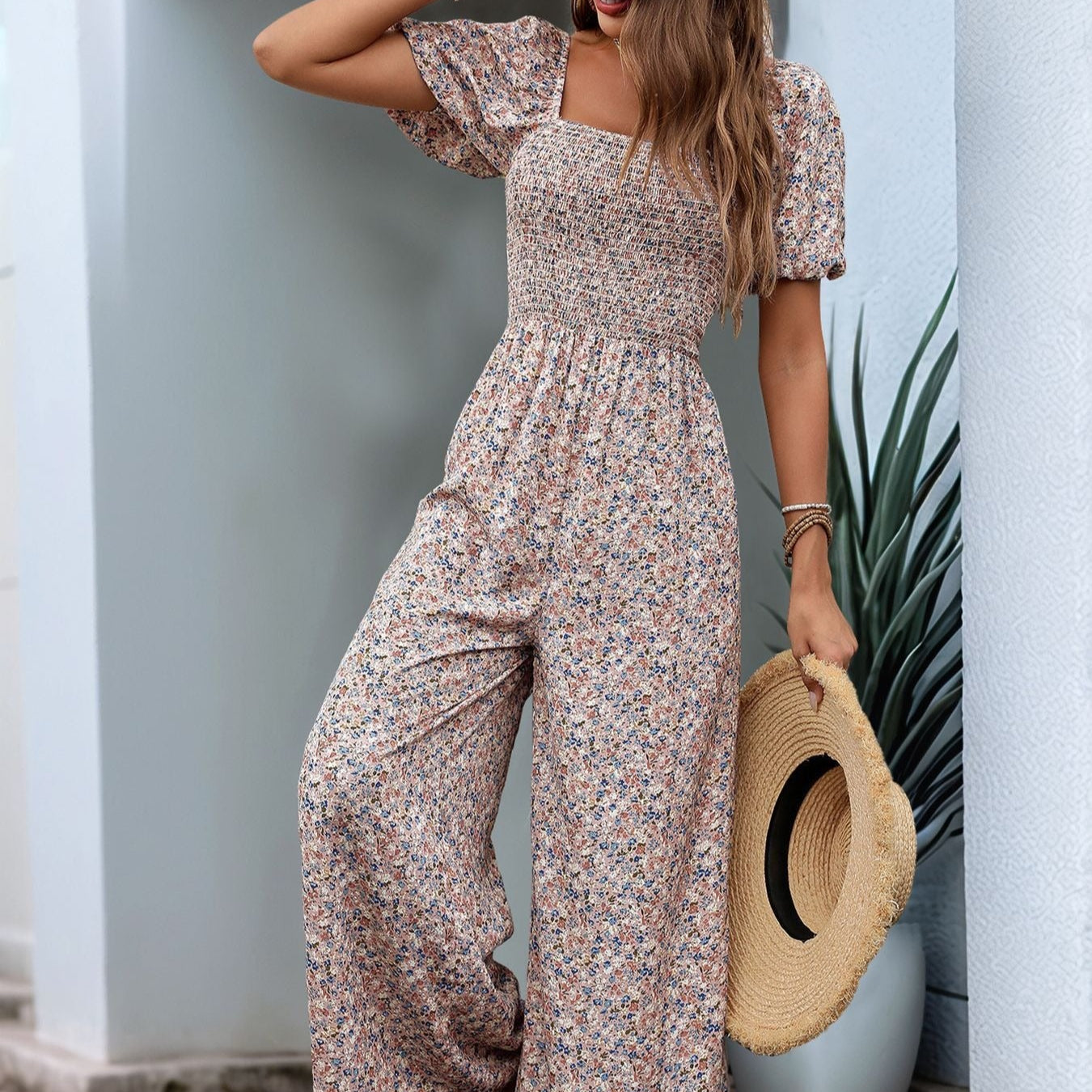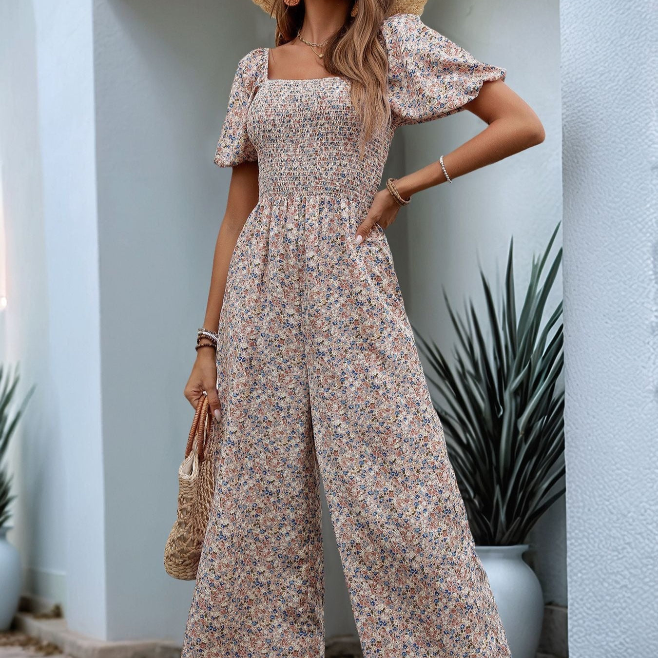 Confeccionado en una tela ligera y fluida, su diseño incluye un escote cuadrado que realza el cuello y mangas cortas ligeramente abullonadas para un toque delicado. La cintura fruncida favorece la silueta, mientras que las perneras amplias aportan libertad de movimiento y un estilo relajado pero refinado.