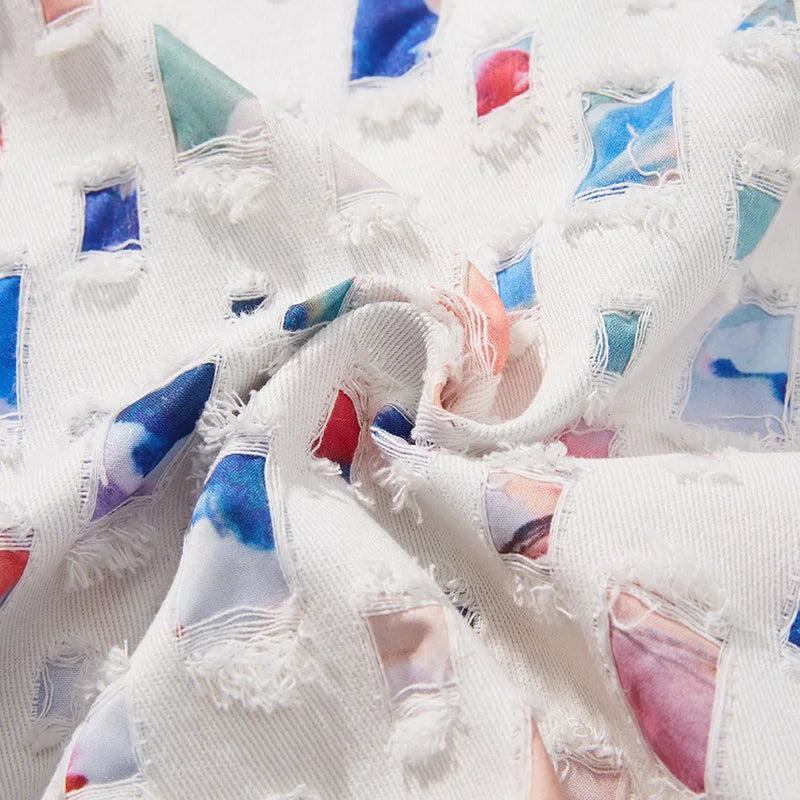 Los cortes deshilachados están de moda esta temporada, y con razón. Sin embargo, hemos ido un paso más allá al incorporar a la mezcla acentos coloridos.