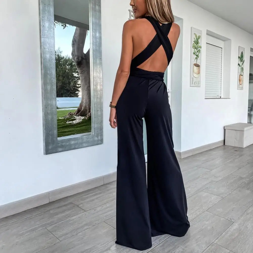 Experimenta la elegancia sin esfuerzo con este mono Sophia - Elegant conespalda cruzada, que presenta un profundo escote en V y un corte alto de pierna ancha que alarga tu figura. El corte sin mangas lo convierte en la elección perfecta para los días más cálidos o los looks a capas, mientras que la cintura acentuada añade un toque elegante, ideal para un estilo chic de día y glamour de noche.