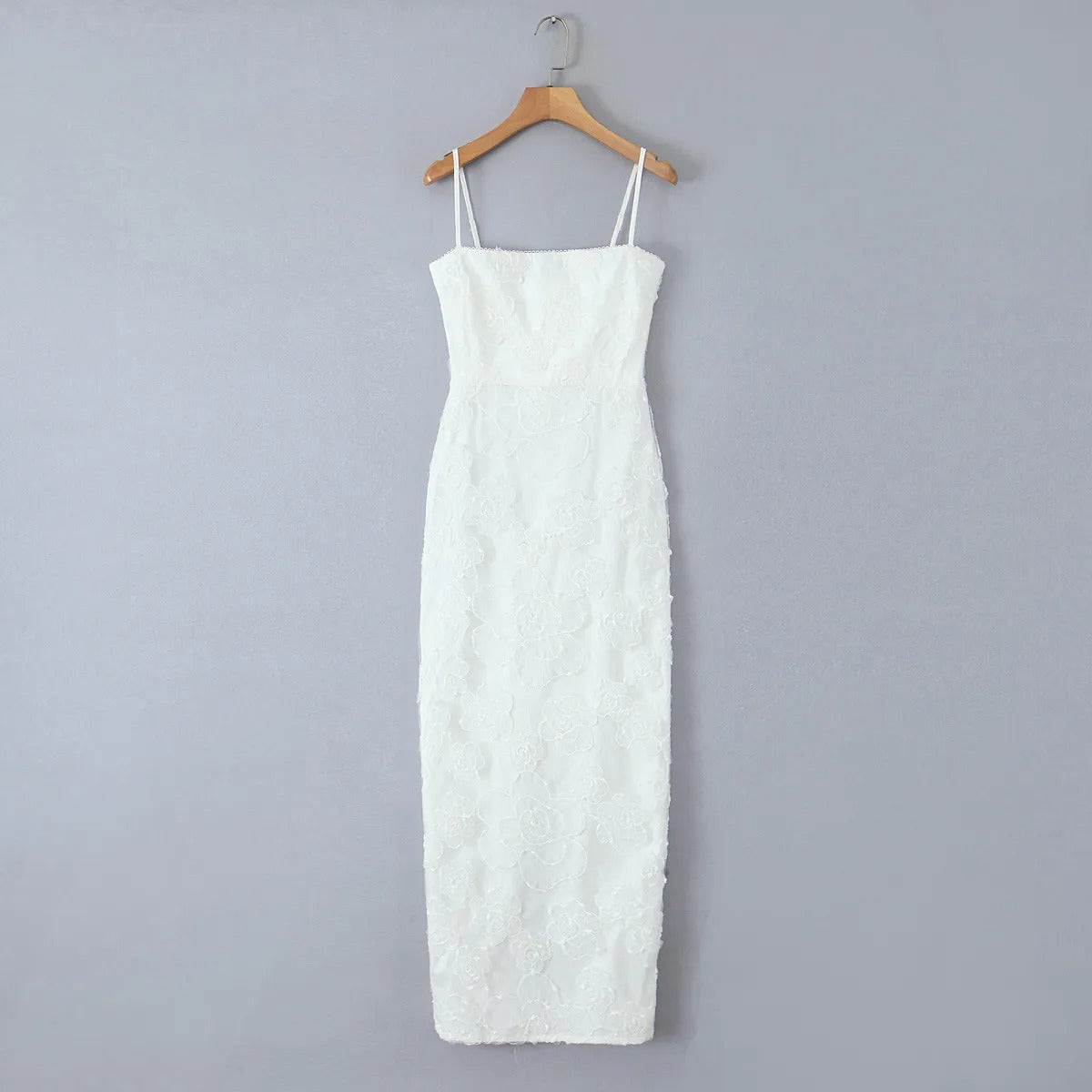 Confeccionado en tejido de encaje floral sobre una base entallada, su estructura realza la figura con elegancia sin esfuerzo. El escote recto con tirantes finos aporta un aire ligero y femenino, mientras que el corte largo ligeramente acampanado equilibra el conjunto con movimiento y fluidez. Cada costura y acabado ha sido pensado para ofrecer una estética refinada.